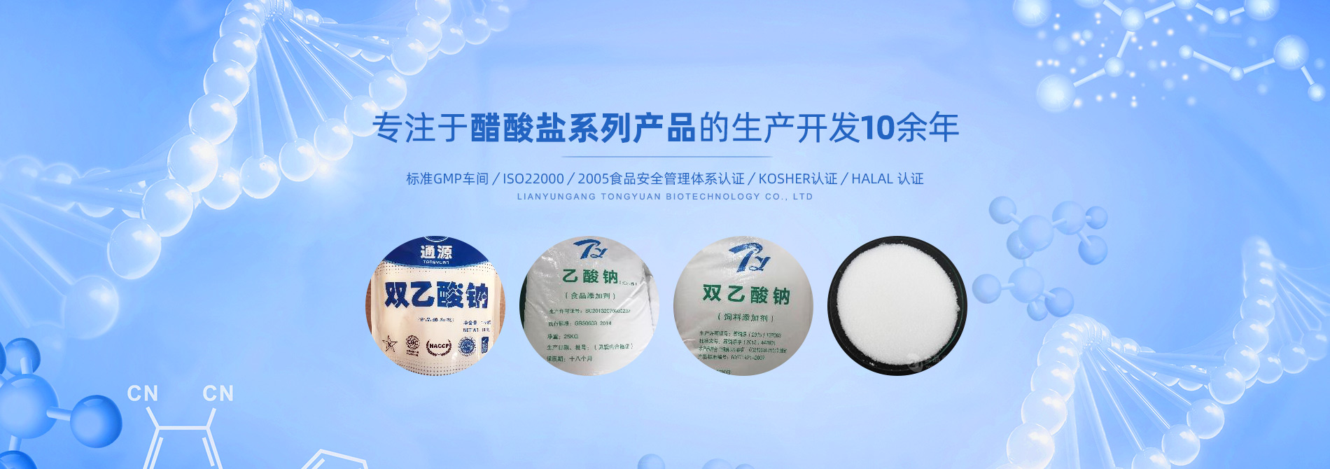連云港市通源生物科技有限公司 是生產(chǎn)雙乙酸鈉、無(wú)水醋酸鈉、三水醋酸鈉、醋酸鉀、乙酸鈉、丙酸鈉、丙酸鈣和氯化鉀等系類(lèi)醋酸鹽產(chǎn)品的專(zhuān)業(yè)制造商。公司專(zhuān)注于醋酸鹽系列產(chǎn)品的生產(chǎn)開(kāi)發(fā)10余年,是國(guó)內(nèi)專(zhuān)業(yè)醋酸酸鹽產(chǎn)品生產(chǎn)基地。 目前,我們已和全球30多個(gè)國(guó)家和地區(qū)建立長(zhǎng)期的業(yè)務(wù)合作關(guān)系,是中國(guó)較大的雙乙酸鈉生產(chǎn)商和出口商之一。作為中國(guó)食品添加劑和配料協(xié)會(huì)理事單位,通源公司已建成標(biāo)準(zhǔn)GMP車(chē)間5000余平方米,通過(guò)了ISO22000:2005食品安全管理體系認(rèn)證、KOSHER認(rèn)證、HALAL 認(rèn)證等,這些都是我們提供高質(zhì)量產(chǎn)品和優(yōu)良服務(wù)的前提和確保。 生產(chǎn)出色產(chǎn)品,提供優(yōu)良服務(wù),滿足顧客需要,是我們努力的目標(biāo)。愿和我們的朋友們攜手,共...